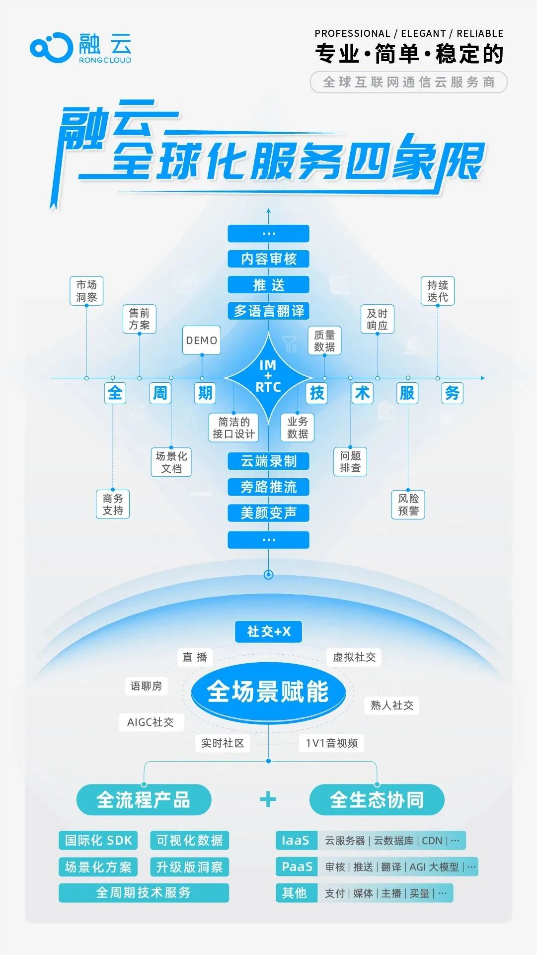 因此融云除了在不断修炼自己的能力、提供更加成熟和完善的解决方案外,还与全球多家优质机构一起在翻译、合规、审核、美颜等多方面提供全生态的服务。