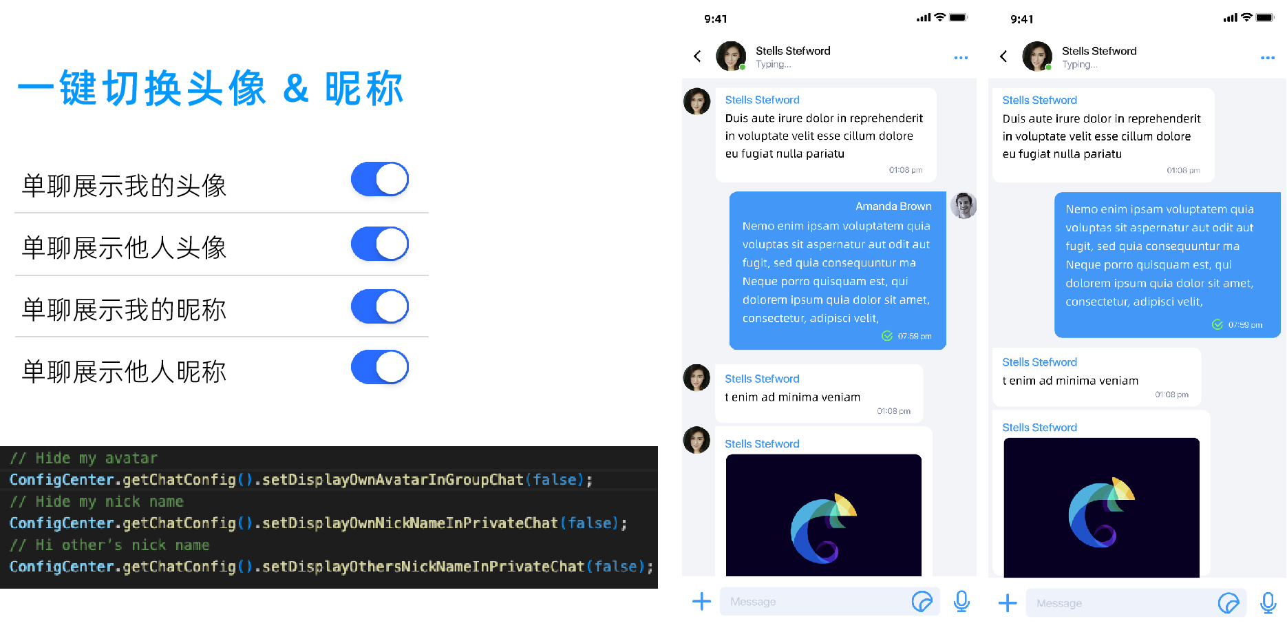 举一个前面提到的例子——“消息回复”,海外用户对于隐私的关注度要高于国内,因此在消息回复页面会自动隐去对方的昵称和头像,这基本是海外社交产品的共同设定。隐去昵称&头像这样更加利于用户隐私保护的功能,开发者采用 Global IM UIKit 只需三个接口调用就可以获得。