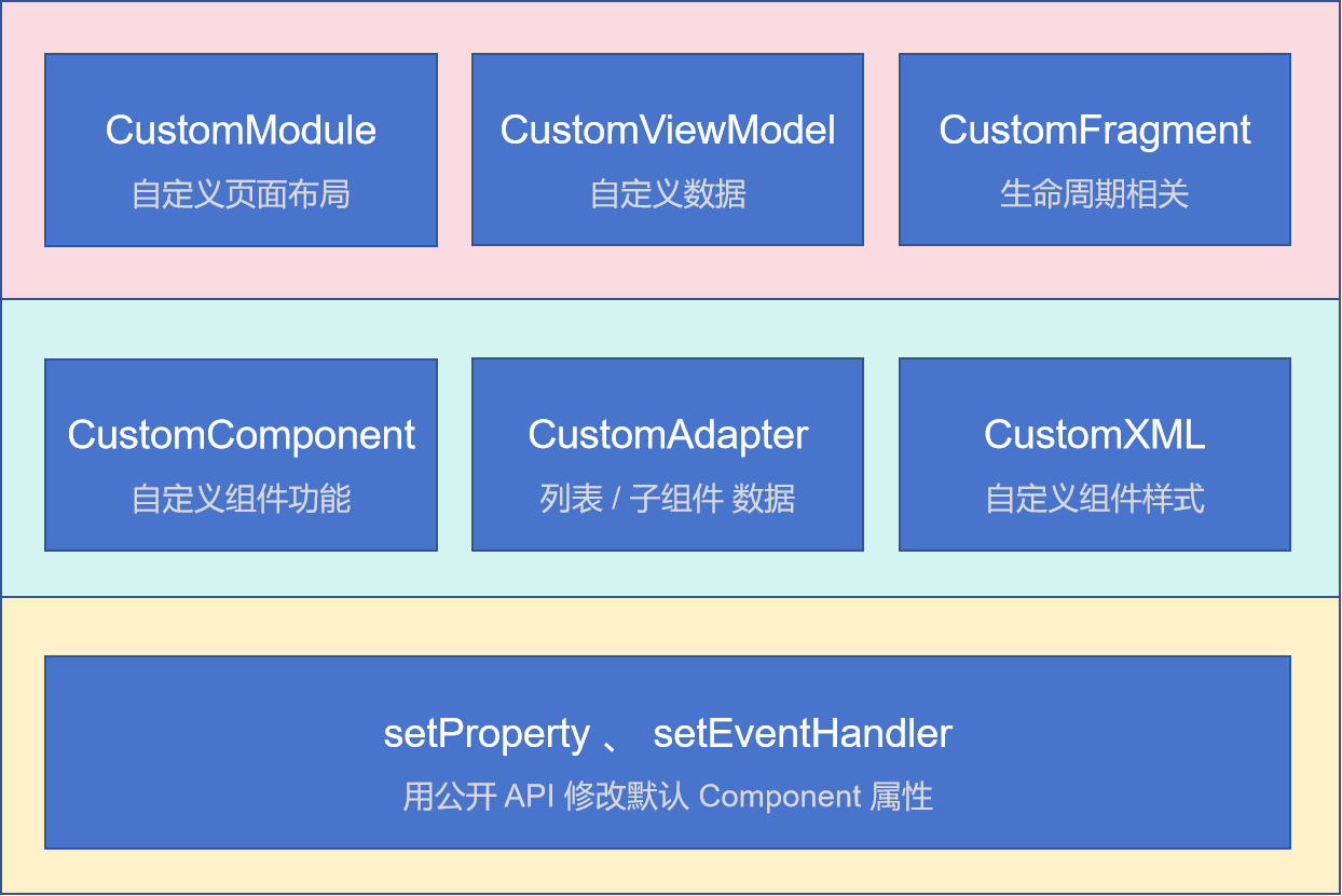针对整个 Module 和所有 Components,开发者可以根据自己的需要进行重写。重写其中一个区域时,其他区域不受影响,既能够保证功能的可用性,又提供了非常灵活的自定义能力。