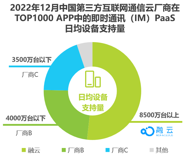 根据艾瑞报告,在 IM PaaS 领域,市场格局已基本稳定。其测算在月独立设备数排名前 1000 的 App 中,融云覆盖的 App 日活设备数合计超过 8500 万台,居于专业互联网通信云厂商之首,超过第二名一倍以上。