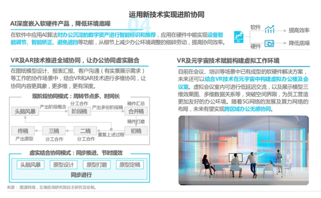 而其中,虚实融合与无感协同正成为新趋势之一。根据艾瑞咨询报告,在运用新技术实现协同进阶的未来趋势中,VR 技术将推动办公协同进入全域协同,拉近现场与远程的办公距离,在多种协作场景中让协同更具象,更多维,更有深度。
