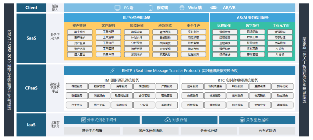 AR 方案的推出,也进一步完善了融云的协同办公解决方案覆盖面。其与资产管理、客户服务、智能运维、应急指挥、安全生产等其他业务应用场景相结合,共同构成了融云的数字化协作通讯中台服务架构。