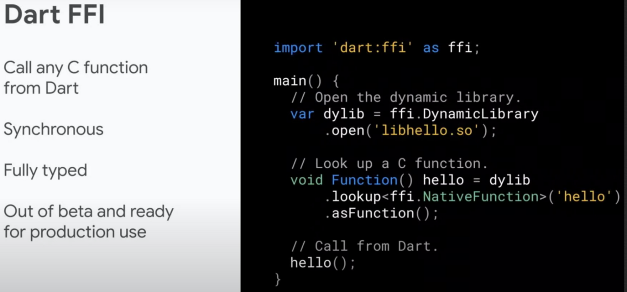 这次更新,Dart 也来到了 2.12 版本,其中最为主要的两点就是全面空安全以及 FFI 的稳定版本。FFI 是一种互操作性机制,可以让开发者调用 c 语言编写的现有代码。在不使用 FFI 的情况下,如果我们想开发 iOS 平台相关的音视频接口,那么我们需要通过 flutter channel 来进行平台接口与 dart 接口的互通。使用 FFI,可以直接用 dart 调用 C 的接口,相比于用 flutter channel 的方式,减少了数据序列化和反序列化所带来的性能损耗。而且 flutter 2.0 还提供了自动生成 FFI 接口绑定的工具,可以根据 C 头文件暴露的接口自动创建 FFI 包装器。