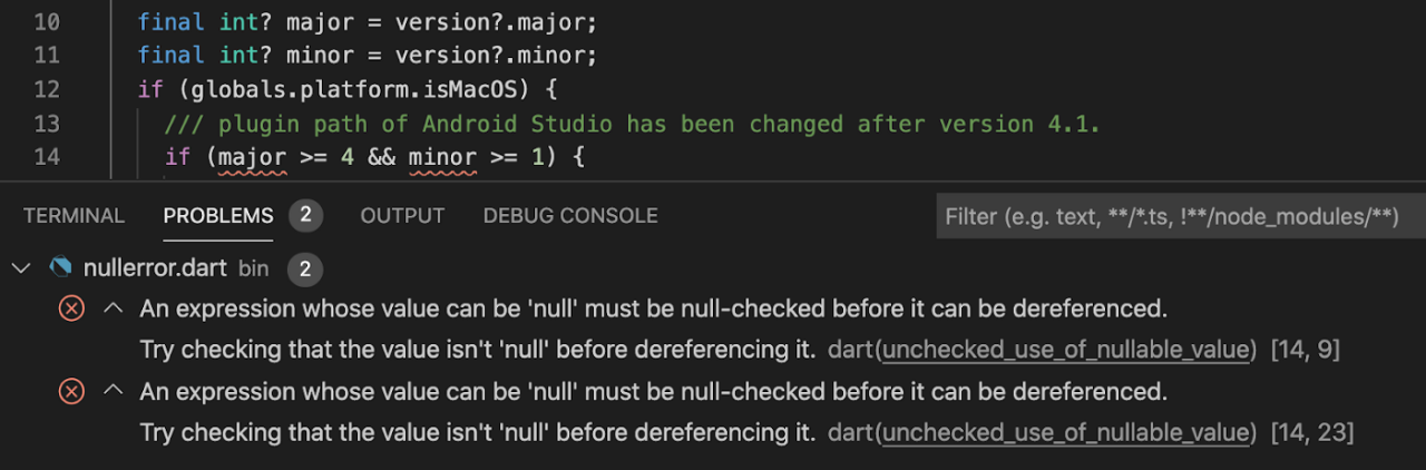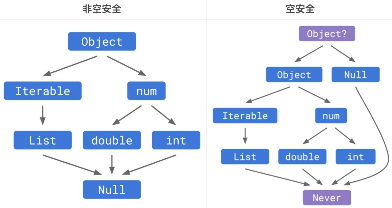 另外一个非常重要的新功能就是全面空安全。空安全是在编译器编译阶段就能判断出代码是否有空指针风险,从而在代码真正运行在设备上时避免空指针异常的一种策略。
