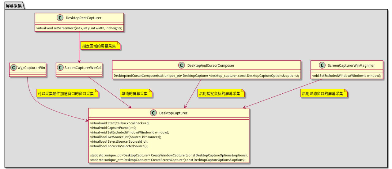WebRTC 中屏幕采集的源码在 webrtc/src/modules/desktop_capture/目录下。在 desktop_capture 目录中的 desktop_capturer.h 中定义了 DesktopCapturer 类,DesktopCapturer 类抽象了屏幕采集要用到的接口。windows 平台的屏幕采集实现,在 webrtc/src/modules/desktop_capture/win 目录下,其中有ScreenCapturerWinGdi类,ScreenCapturerWinMagnifier类,DesktopAndCursorComposer类,WindowCapturerWinGdi 类,WgcCapturerWin 类。这些实现类,分别实现了 windows 平台的屏幕采集和窗口采集功能。