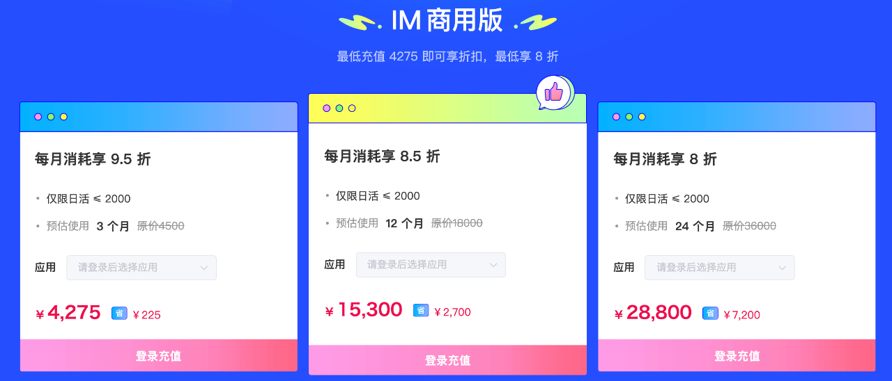 第一重优惠,面向IM开发者。分为日活≤ 2000 的用户以及日活>2000 等多个档位的优惠福利。以开发者的应用日活≤ 2000 为例,IM 商用版最低充值 4275 元,最低预估使用 3 个月,即可开始享折扣;如果预估使用时长 2 年,则享受低至 8 折的优惠,只需预存 28800 元,节省了 7200 元。当月预存,当月享受折扣。