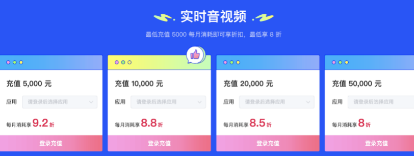 第二重优惠,面向实时音视频的开发者。最低充值 5000 元,即可开始享受折扣,并且当天充值,当天即可享受折扣。如果开发者充值 50000 元,则可享低至 8 折的优惠。