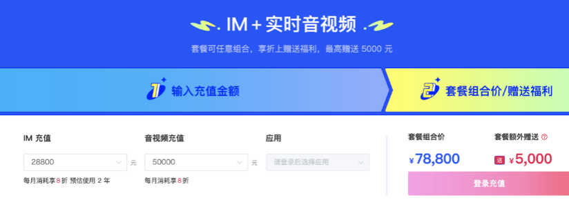 并且,在任意组合充值后,开发者还可享折上赠送的福利,最高赠送 5000 元优惠。例如,日活≤ 2000 的用户,开发者为 IM 充值 28800,预估使用 2 年,为音视频充值50000,那么可享优惠套餐组合价 78800 元和额外赠送的福利 5000 元。