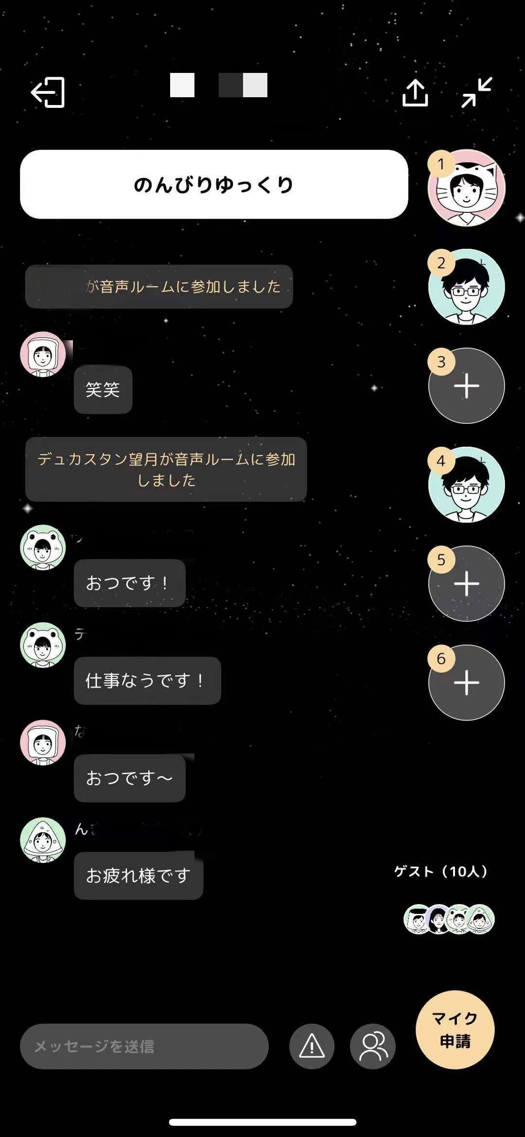 GRAVITY 的每个房间有六个麦位,其他进入房间的用户会自动落座观众席。如果麦位有余,观众可以发送请求申请上麦。IM 信令消息,让上麦、下麦、轮麦、禁麦等麦位管理更轻松,保证语聊房内用户的有序互动。