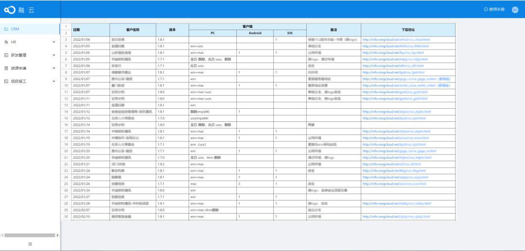 对于已经生成的安装包,融云还提供客户端出包快速回溯,可以查看到所有已发布的客户端类型,及企业发布所有客户端的版本。此举主要是便于客户端的升级和问题的排查。