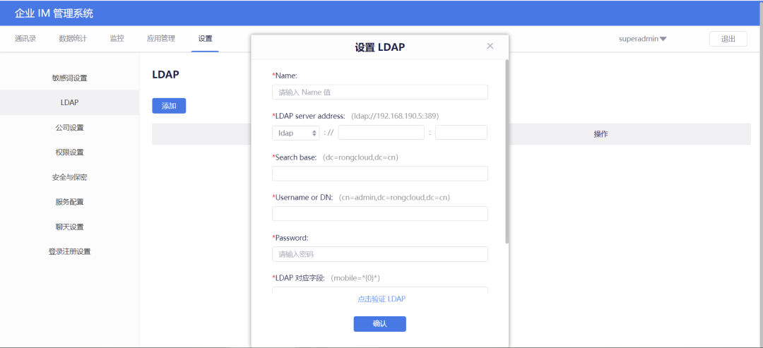 第一,支持快速与第三方 LDAP 系统对接。很多企业对于员工账号的管理,都是基于 LDAP 的。在融云协同办公平台中,只需输入对应参数,点击确定,即可完成与第三方 LDAP 系统的对接。