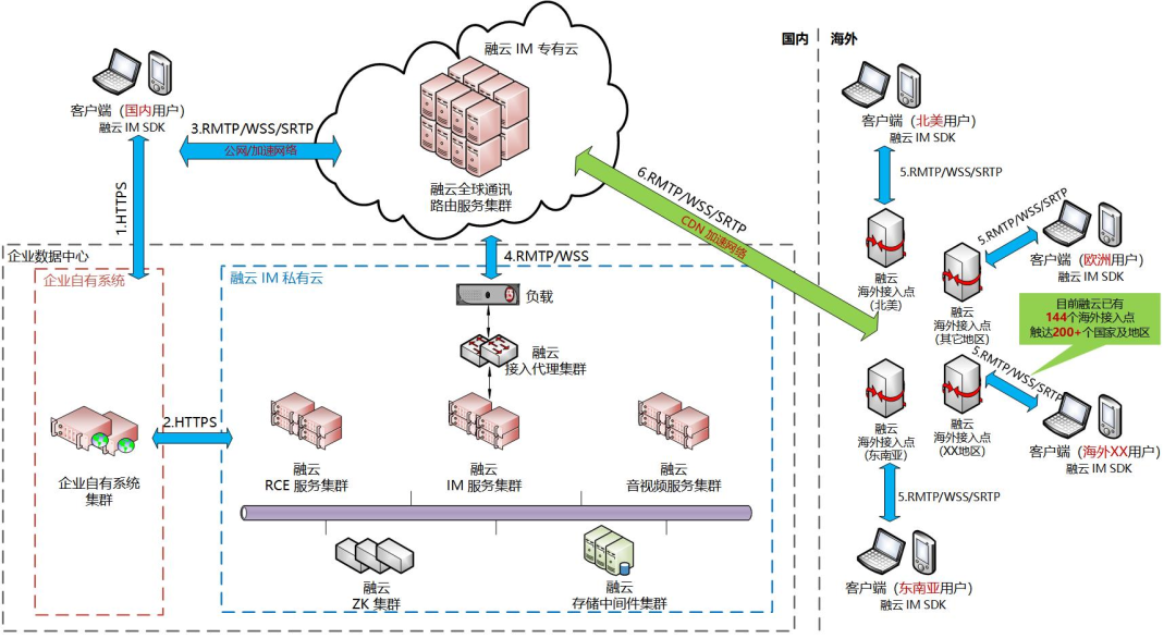 为应对企业全球化办公需求,融云提供全套产品的全球通讯加速能力。