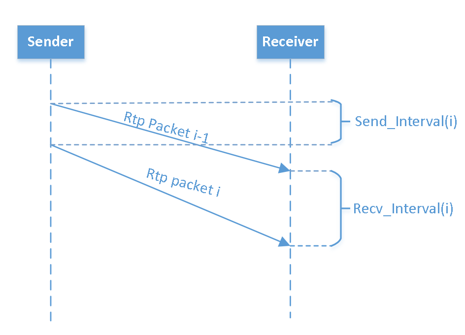 RTT 测量比较直观,但是由于是测量双向延时的总体情况,因此反向的延时变化会对媒体流方向的网络拥塞判断造成干扰。OWD 延时观测则避免了这个问题。如下图所示: