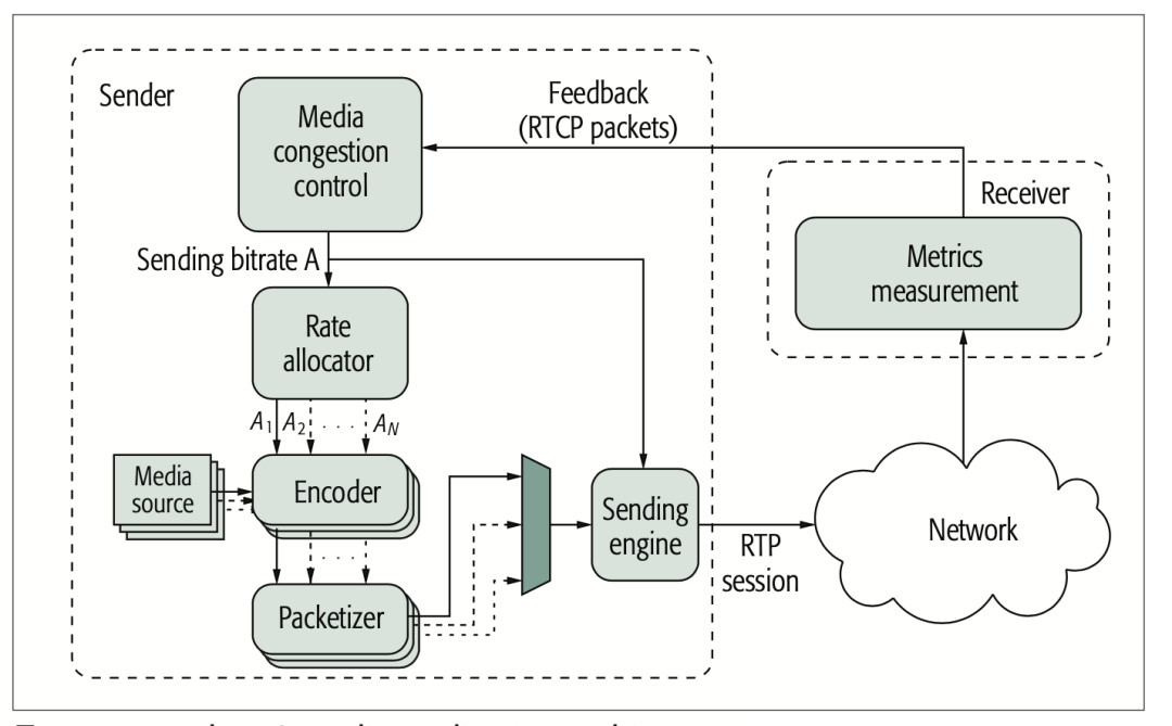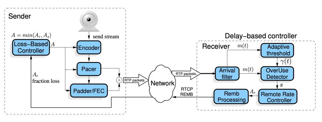 我们可以看到整个拥塞控制机制都在发送端实现,接收端只是反馈相应的测量数据。
