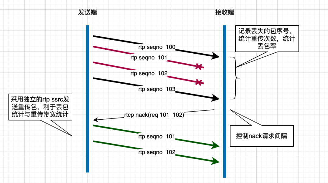 在 RTP/RTCP 协议中,丢包重传技术简单来讲就是接收端根据包序列号的连续性判断是否丢包,通过向源端发送 RTCP 中的 NACK 请求,要求源端重传指定的数据包。丢包重传流程如下图所示: