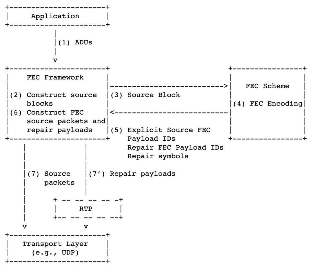 下面介绍一下 FEC 在实时音视频系统中的基本应用框架,发送端应用框架如下图所示: