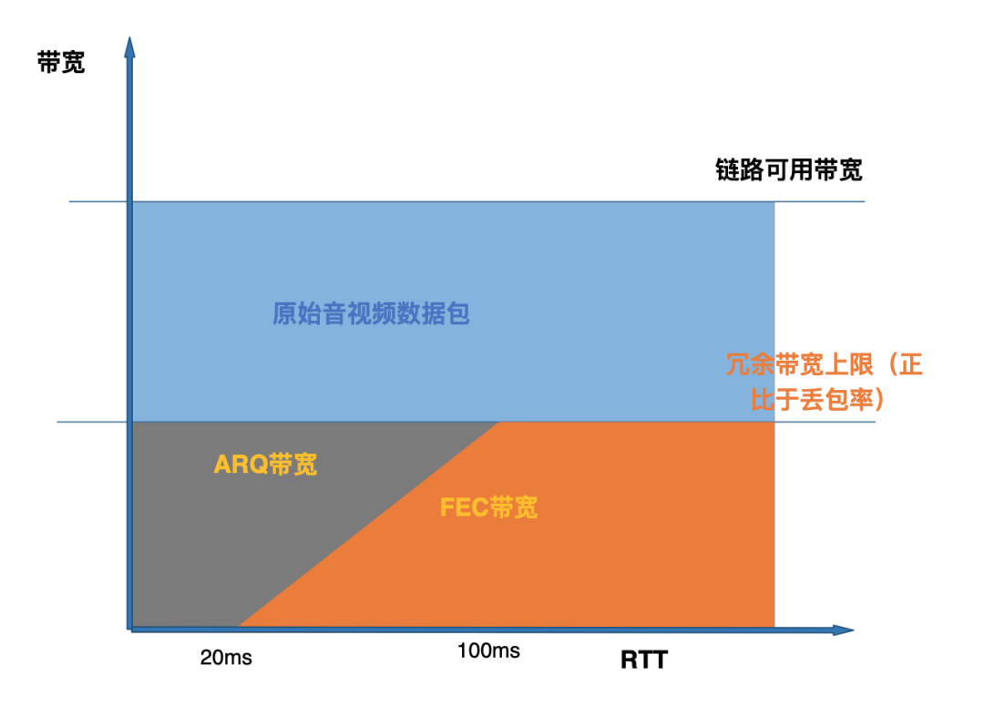 随着 RTT 的上涨,FEC 的保护占比增加,最终由 FEC 单独负责丢包修复。