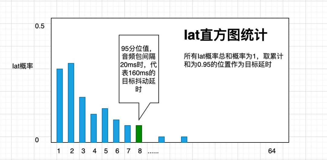 WebRTC 的音频抖动延时估计在其内部的 NetEQ 模块中,图中的 Iat 意为间隔达到时间,WebRTC 通过对音频包到达间隔用直方图进行统计,取 95 分位数的延时时长作为音频抖动延时。