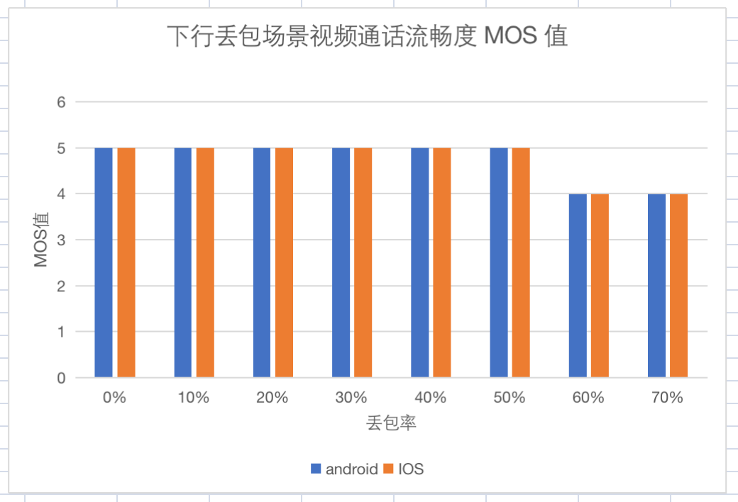 在 60%、70% 的高丢包场景下,Android 和 iOS 移动端测试结果在流畅度方面 MOS 值仍可以达到 4 分。