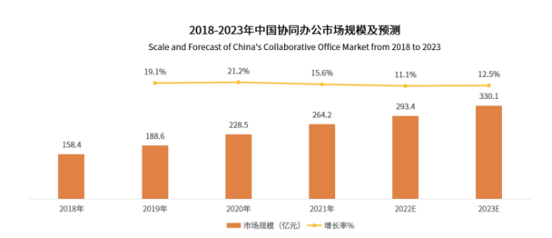 艾媒咨询数据显示,2021 年中国协同办公市场规模达 264.2 亿元,中国数字经济助推企业高质量发展,企业数字化转型已成定势。预计 2023 年市场规模将达 330.1 亿元。