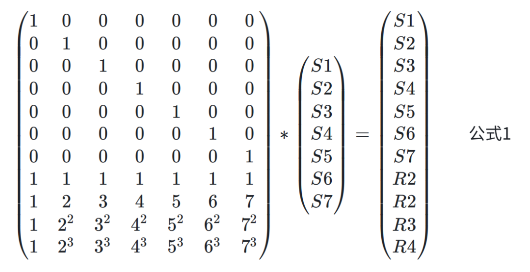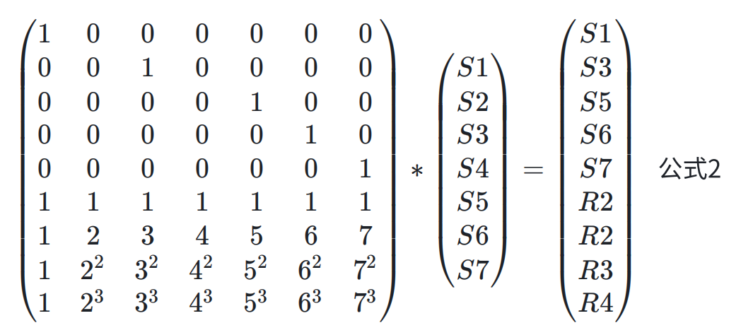 下面以范德蒙矩阵做简要说明。以(7,4)为例,即 7 个原始包产生 4 个冗余包,原始包为 S1、S2、S3、S4、S5、S6、S7,冗余包为(R1、R2、R3、R4)。原始包和冗余包的关系如下: