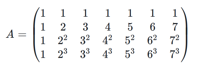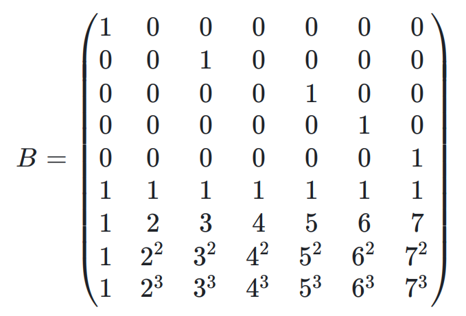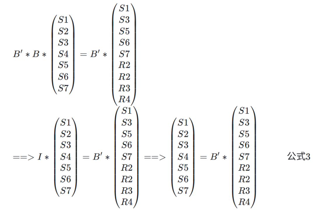 根据范德蒙矩阵可逆特点, 所以 B 也是一个可逆矩阵,记为 B,则恢复包过程其实主要就是求解 B' 矩阵的过程,对公式 2 做如下推导,即可求解原始包,如下所示: