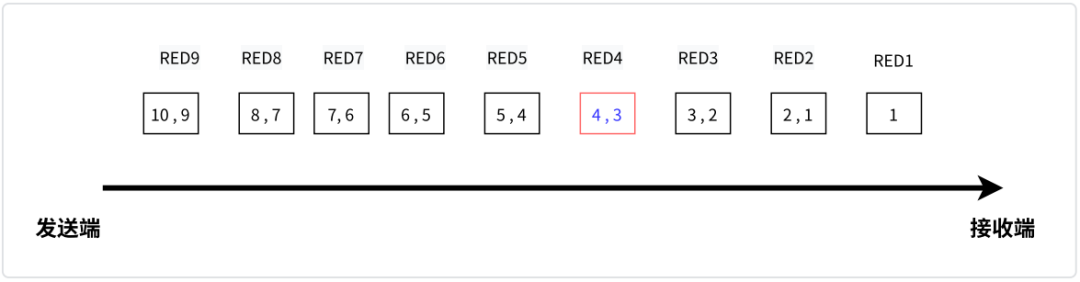 上图中,发送端除了发送当前包,还会携带之前一个包做为冗余包,当上图的 RED4 包丢失,即 4,3 包丢掉时,后续的 RED5 包到达,包含了 5,4 包,结合之前 RED3 包(包含了 3, 2 包),可以恢复丢失的包。