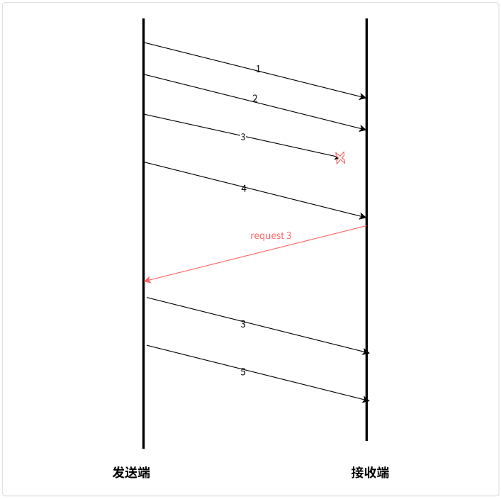 数据包 3 第⼀次发送时,接收端没有收到,便向发送端发起 3 的重传请求(WebRTC 中使⽤ NACK RTCP 包),发送端收到了接收的重传请求后,则再次重发报文 3。