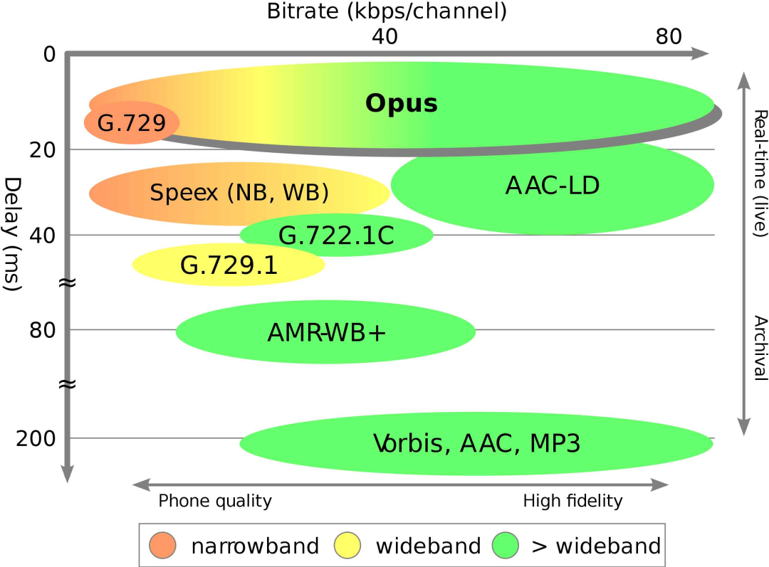 现有的音乐编解码器(例如 MP3、Vorbis 和 HE-AAC)具有 100 毫秒或更多的延迟,而 OPUS 的延迟要低得多,但在质量上与比特率相当,如下图所示:
