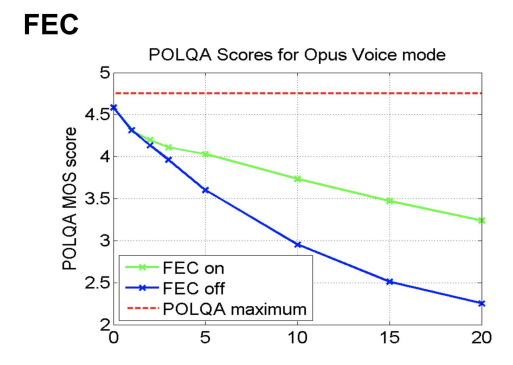 从图中可以看出,FEC 开启后,在 20% 丢包情况下,音频 MOS 值提升还是非常明显的。