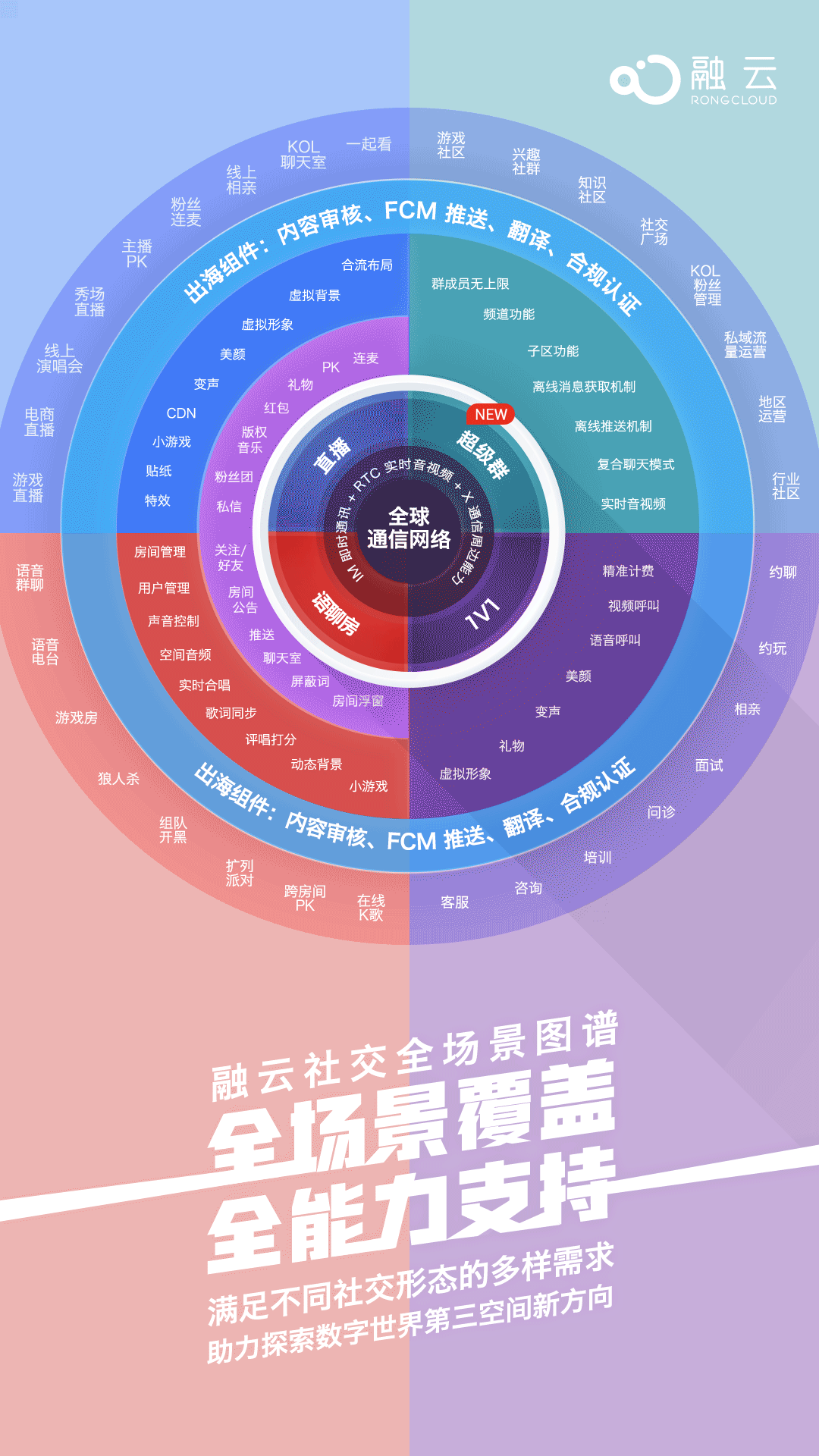 随着服务的不断深入和技术的迭代演进,融云推出 IM + RTC + X“全”通信解决方案,在 IM 和 RTC 核心通信能力之外,提供贴合业务的更多周边能力。比如,直播场景必备的美颜、版权音乐、CDN 等,让开发者更快地上线业务。