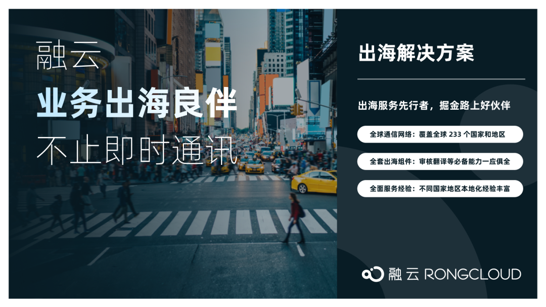 出海正当时,融云将继续积累和发挥产研优势,持续完善服务生态,与出海开发者一起开拓和探索海外业务,成为广大开发者出海路上的最佳业务合作伙伴。