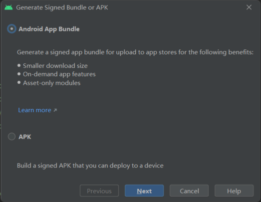 要生成一个 AAB 包非常的简单,我们只需要在打包的时候从选择 APK 改为选择 Andriod App Bundle,剩下的流程跟生成 APK 文件完全一致。