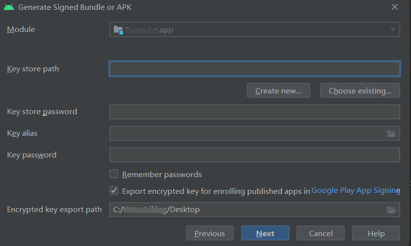 Google Play 会使用此密钥对经过优化的 APK 签名。这里推荐勾选 Export encrypted key for enrolling published apps in Google Play App Signing 将密钥导出并且上传到 Google Play,如下图所示。