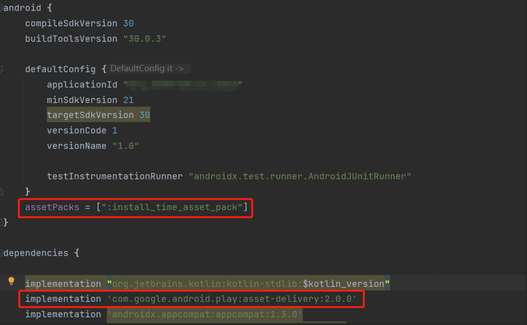 1. install-time:Asset Pack 在用户安装应用时分发,也被称为“预先”资源包,可以在应用启动时立即使用。这些资源包会增加 Google Play 商店上列出的应用大小,且用户无法修改或删除。