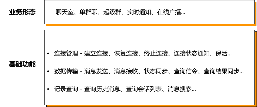 最基础的是连接管理类的需求,这是即时通讯业务的基础。 接着是两端基于连接的数据传输,这里我们要关注的是前后端通讯时的数据传输协议,也就是对于数据的序列化和反序列化的过程管理。