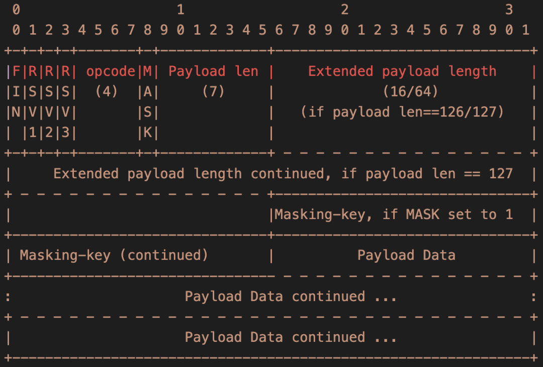 首先 WebSocket 数据传递的最小单元是数据帧。一段数据会被分割组装为最少一个数据帧写入到 TCP 的缓冲区,如果数据比较大,就会被分拆为多个数据帧,然后对端接收到之后再进行数据帧还原。