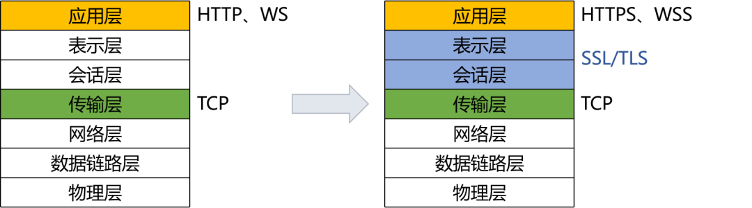 OSI 模型中定义中,会话层负责两端的会话维持、身份鉴别等,表示层负责对数据的加解密。在此之上,应用层协议的安全性是等同的,HTTPS 和 WSS 协议就是安全版的 HTTP 和 WebSocket 协议。
