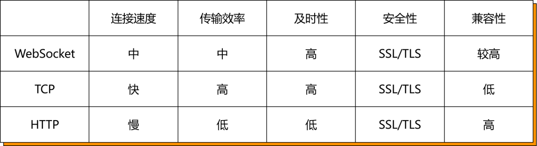 归类来看,WebScoekt 和 TCP 的即时性基本属于同一级别的,HTTP 则比他们要弱。