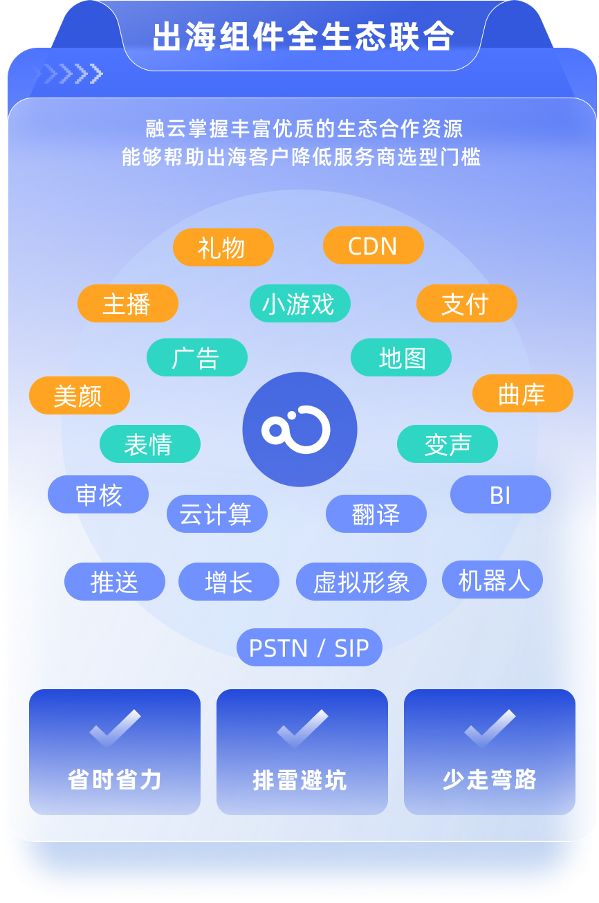 融合是生态的隐喻,泛娱乐场景应用的社交化演变使通信技术的能力纵深更加丰富。如今的出海,已不仅是认知的博弈,更是资源整合能力的比拼。融云一站式全生态出海解决方案,助力开发者以生态之力应战,用生态承接更多的商业化机遇。