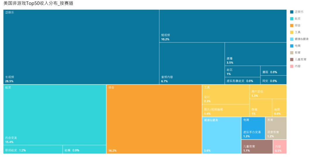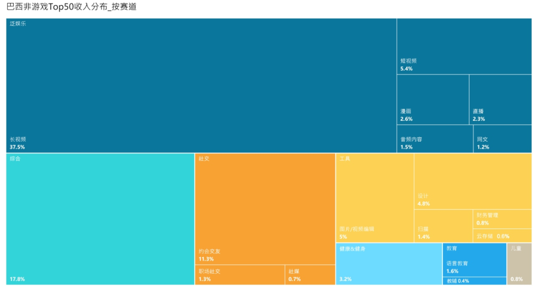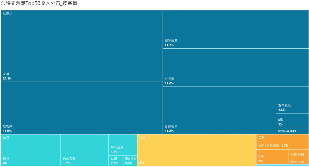 以沙特阿拉伯为代表的中东地区 ARPU 相对较高,头部玩家付费豪气十足。主要是大 R 用户在享受的直播 App,在经历几年的快速发展后,依然能够在整个非游戏 Top50 收入里面占到 1/4 的比重。