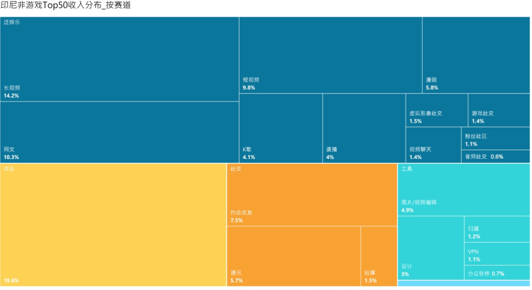 相较于其他市场的 1%-2% 之间,印度尼西亚网文在非游戏 Top50 收入中占比为 10.3%,漫画占比为 5.8%。