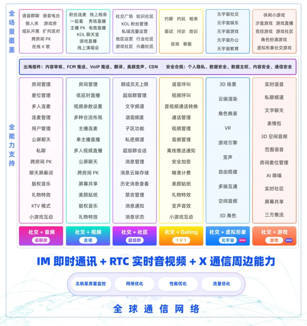 在这个厚积薄发的过程中,融云基于“社交+X”的 6 大品类,推出了开箱即用的语聊房、直播、超级群、1V1、元宇宙、游戏等场景化解决方案,更好地服务出海开发者对创新场景的探索。