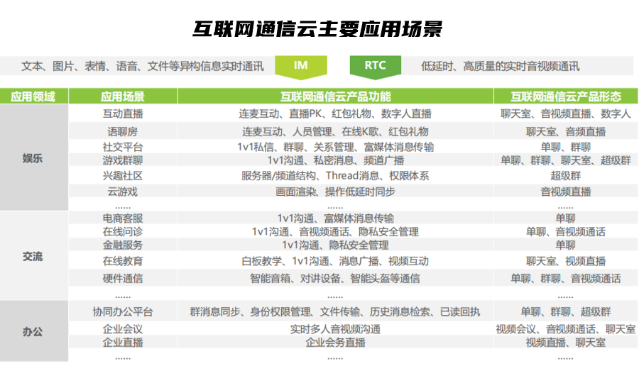 根据艾瑞咨询最新发布的《2024 年全球互联网通信云(IM+RTC)行业研究报告》(点此获取完整报告),通信云主要包括 IM PaaS 和 RTC PaaS 两大类,为各行业、各场景的信息传递与实时沟通提供支撑。