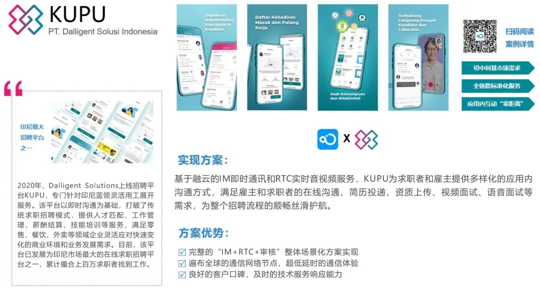 KUPU 就是基于当地用户的这种特点拓展 IM 的实用价值,以融云 IM 为基础研发的蓝领招聘平台。目前,其已经发展为印尼市场最大的在线求职招聘平台之一,并于近期获得印尼移动运营商 PT Smartfren Telecom Tbk 的 500 万美元投资。