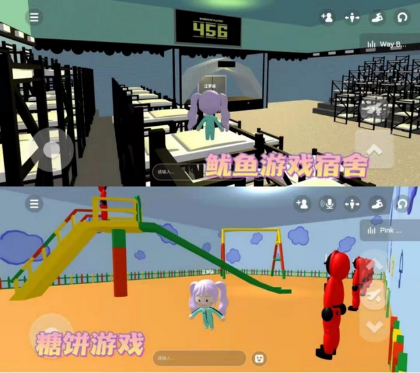 很多用户会将现实生活中的场景“扒”下来复刻到 BUD 中,比如“鱿鱼游戏关卡”、“泰坦尼克号经典场景”、“小黄人乐园”等场景。用户在创作的同时,还可以到他人设计好的创作空间里跑酷。