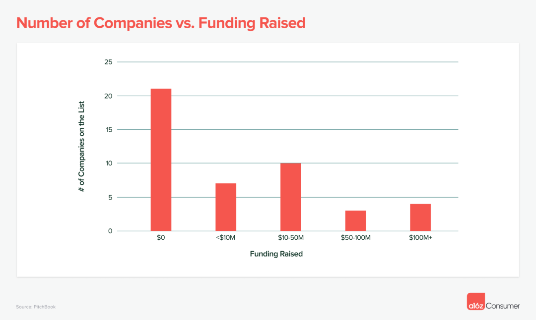 根据 PitchBook 数据,其余 45 家公司中,有 48% 起步于自筹资金,这意味着以相对较少的资金也可能快速推出全新的大型 AI 产品。另外也有 15% 的公司已经获得了超过 5000 万美元的融资。