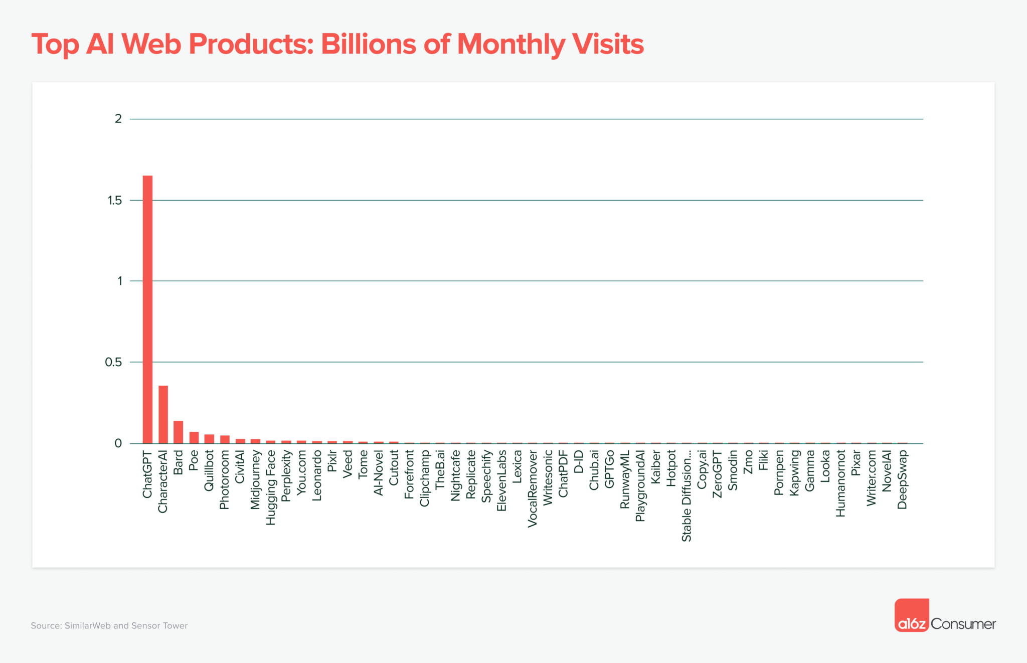 带着这些问题,我们查看了 SimilarWeb 的流量数据(截至 2023 年 6 月),以月访问量为标尺选出了排名 TOP50 的 GenAI 产品,并分析了这些产品的增长进程和流量来源。