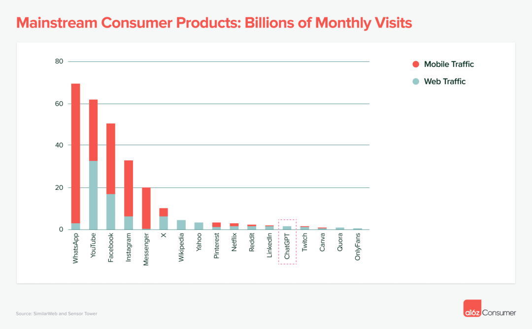 与主流消费者产品相比,即使体量最大的 GenAI 产品也仍然相当小。算上 Web 端和移动端应用流量的总和,ChatGPT 在全球范围内的排名与 Reddit、LinkedIn 和 Twitch 相似,但仍远低于 WhatsApp、YouTube、Facebook 等巨头。
