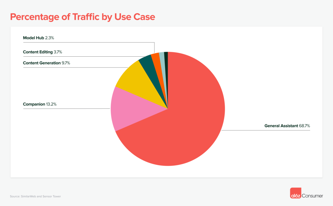 在更广泛的内容生成类别中,图像生成是流量最高的用例,占 41%;其次是专业写作工具占 26%;视频生成占 8%。